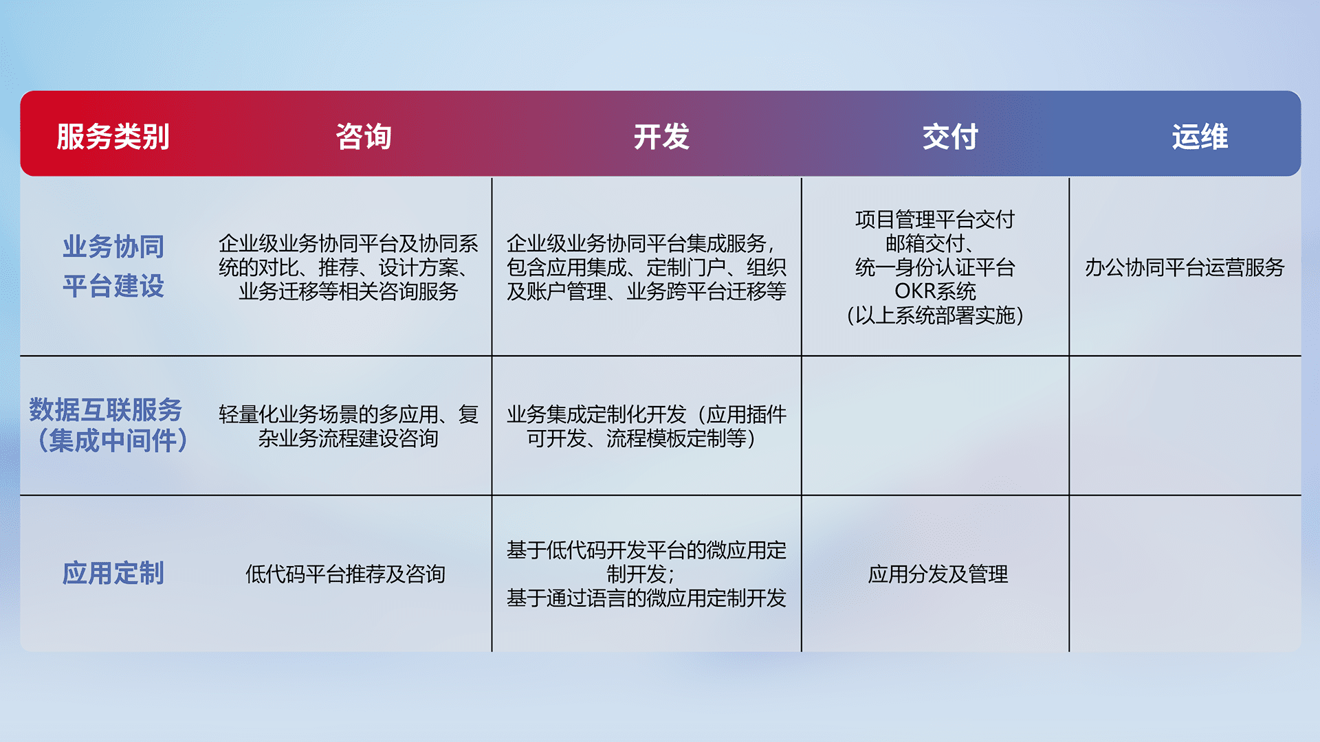 针对钉钉、、、企微、、IDaas等平台级产品提供产品的规划、、、、方案、、交付、、定制化开发等服务,,实现如统一协同办公、、、智能客户服务、、、混合会议管理、、、、智能数据查询、、、等业务场景,,,实现数字化转型。。。